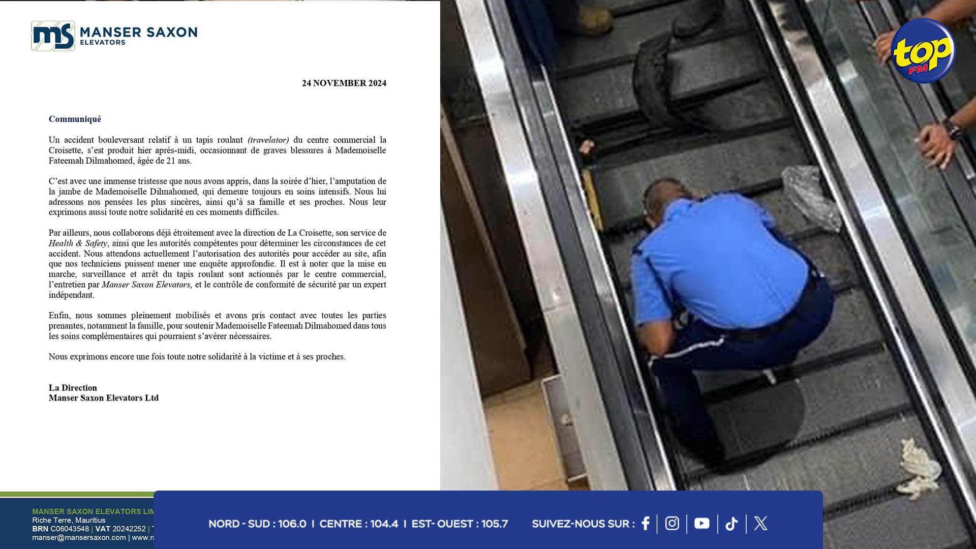 Manser Saxon Elevators, chargé de l'entretien des travelators du centre commercial Grand Baie La Croisette, a exprimé ce dimanche sa profonde solidarité envers Fateemah Dilmahomed et sa famille, suite à l’incident dramatique survenu samedi.