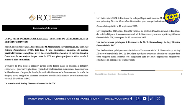 Le communiqué revient également sur la démission et l’arrestation de Me Junaid Haroon Fakim, ancien commissaire de la FCC. Selon la Commission, le vendredi 24 octobre 2025, un suspect nommé Christian Thomas, entendu dans le cadre de l’enquête sur M. Ravatomanga, a formulé de graves allégations contre Junaid Fakim lors de sa déposition, en présence de son avocat.