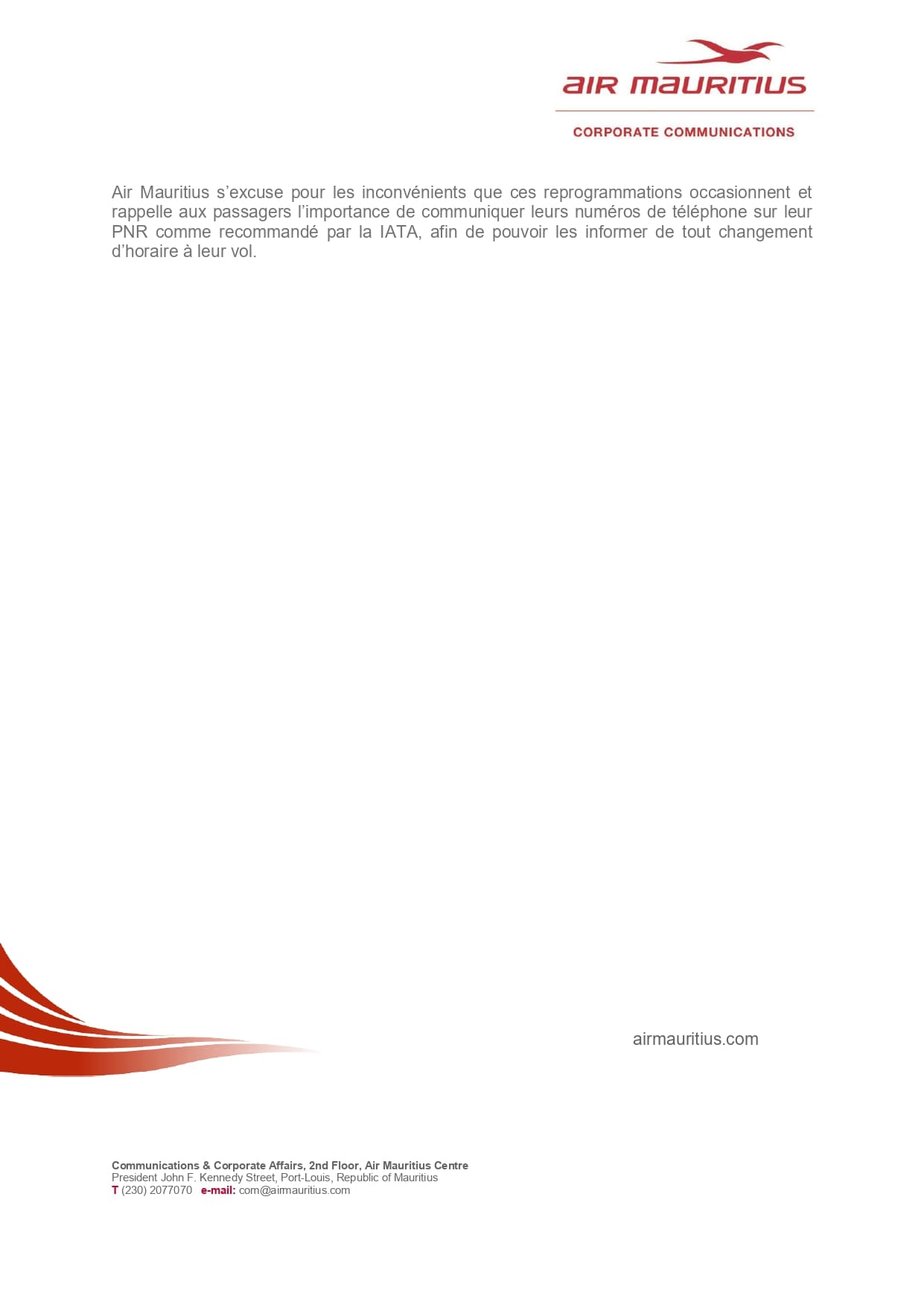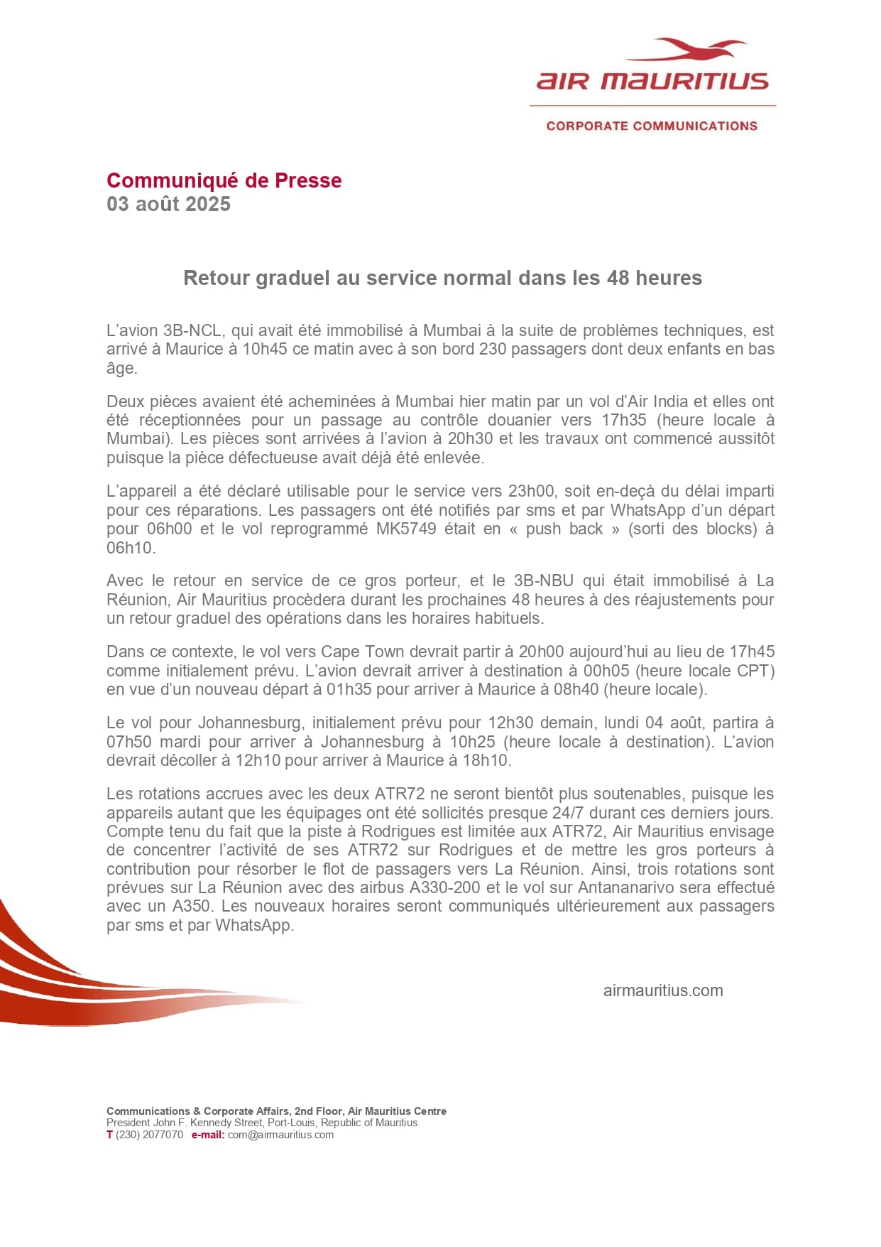 Avec le rétablissement du 3B-NCL à Mumbai et la remise en service du 3B-NBU à La Réunion, Air Mauritius prévoit des ajustements opérationnels sur les 48 prochaines heures afin de rétablir progressivement ses horaires réguliers.