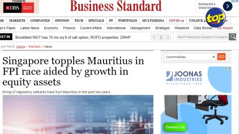 Main picture Offshore : Singapour devance aussi Maurice sur le plan des investissements de portefeuille étrangers en Inde voir plus