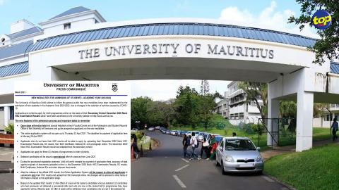 Main picture Université de Maurice : l’inscription en ligne pour la nouvelle année académique 2021/2022 basé sur le Secondary School December 2020 Mock HSC Examination voir plus