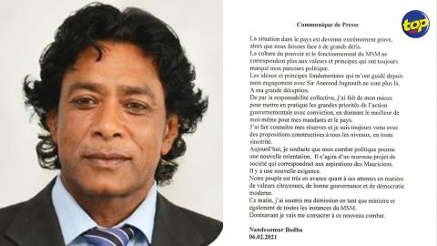 Main picture Breaking NEWS : Nando Bodha soumet sa démission en tant que ministre des affaires étrangères et de toutes les instances du MSM voir plus