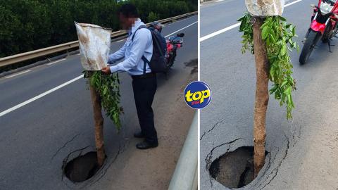 Main picture Sur un pont à Case Noyale : Un facteur place une branche ornée d’un sac blanc dans un trou dans la rue afin d’avertir les usagers de la route voir plus