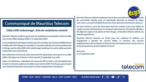 Main picture Acte de vandalisme sur le câble sous-marin LION : Mauritius Telecom chiffre les pertes à plus d’un million de roupies voir plus