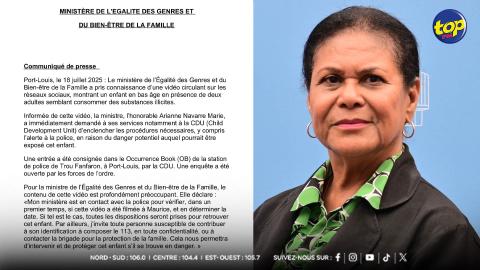 Main picture Un enfant filmé en présence de présumés consommateurs de drogue : le ministère de l'Égalité des Genres, Arianne Navarre-Marie réagit voir plus