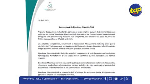 Main picture Traitement des eaux usées : Bioculture (Mauritius) Ltd défie les accusations et invite les autorités à vérifier ses installations voir plus