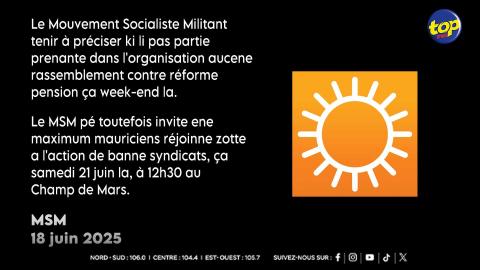 Main picture Mobilisation syndicale contre la réforme du BRP : le MSM clarifie sa position et apporte son soutien Dans une note envoyée aux salles de rédaction, ce mercredi 18 juin, le Mouvement Socialiste Militant (MSM) a clarifié sa position concernant la manifestat voir plus