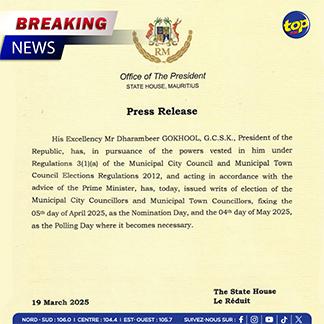 Main picture Municipales 2025 : Le président de République émet les writs of election et fixe la date du Nomination Day fixé au 5 avril et le jour du scrutin au 4 mai voir plus