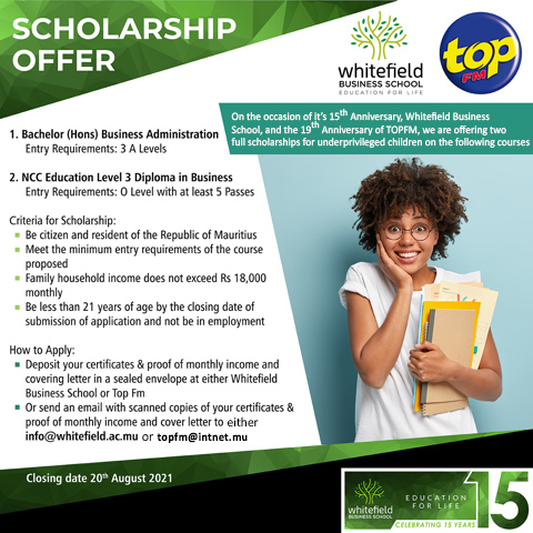 Vous pouvez les déposer à la Station radio de TOPFM (Peninsula Building -Caudan) ou au siège de Whitefield Business School, ou envoyer vos applications aux adresses suivantes : topfm@intnet.mu ou info@whitefield.ac.mu