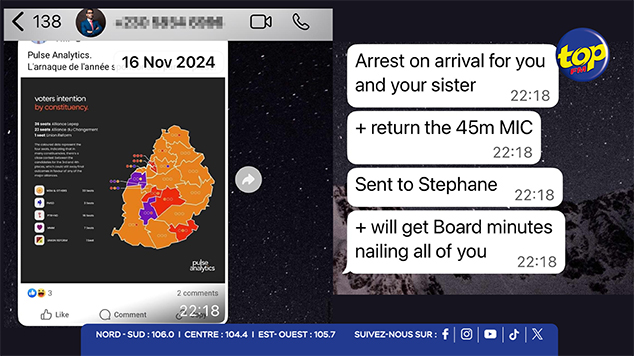 Le 16 novembre 2024, soit le lendemain de la nomination de Rama Sithanen, il aurait envoyé un message WhatsApp à Aditi Boolell affirmant qu’il « obtiendrait les procès-verbaux du conseil pour tous vous coincer » et qu’il fallait « rendre les 45 millions à la MIC ».