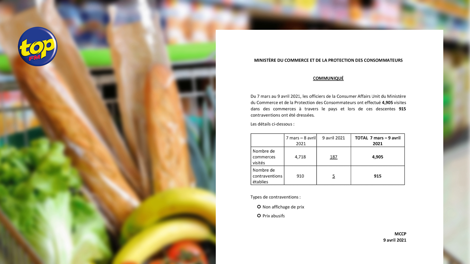 Au total, 4 905 visites ont été faites par les inspecteurs de la Consumer Affairs Unit du ministère du Commerce et de la Protection des Consommateurs depuis le début du confinement national.