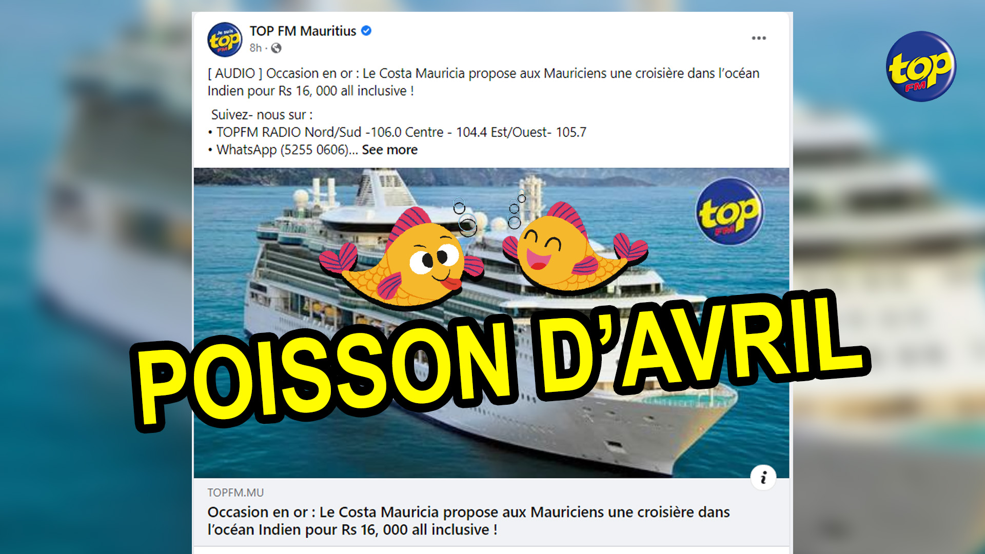 Depuis ce matin, Top FM vous annonce dans ses différents points infos ainsi que sur son site web qu’un bateau de croisière, rebaptisé Costa Mauricia, vient d’être acquis par un Mauricien. Pour marquer l’occasion, ce dernier, un dénommé Ricky Pongamalon, basé à Monaco, allait offrir cette croisière dans l’océan Indien aux Mauriciens à un tarif promotionnel de Rs 16 000 au lieu de Rs 40 000, all inclusive !