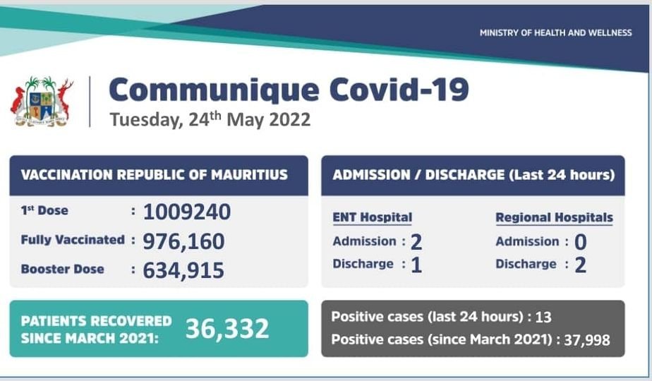 Naresh: Le 24/05/2022 à 16:44 | MAJ à 10/07/2024 à 19:00 Main picture Publié : Le 24/05/2022 à 16:44 | MAJ à 10/07/2024 à 19:00 FB TW WS Les deux patients ont été admis à l’hôpital ENT. Trois patients ont, eux, pu quitter les hôpitaux. Depuis mars 2021, 36 332 cas de contamination ont été enregistrés. Mots clés Covid 19