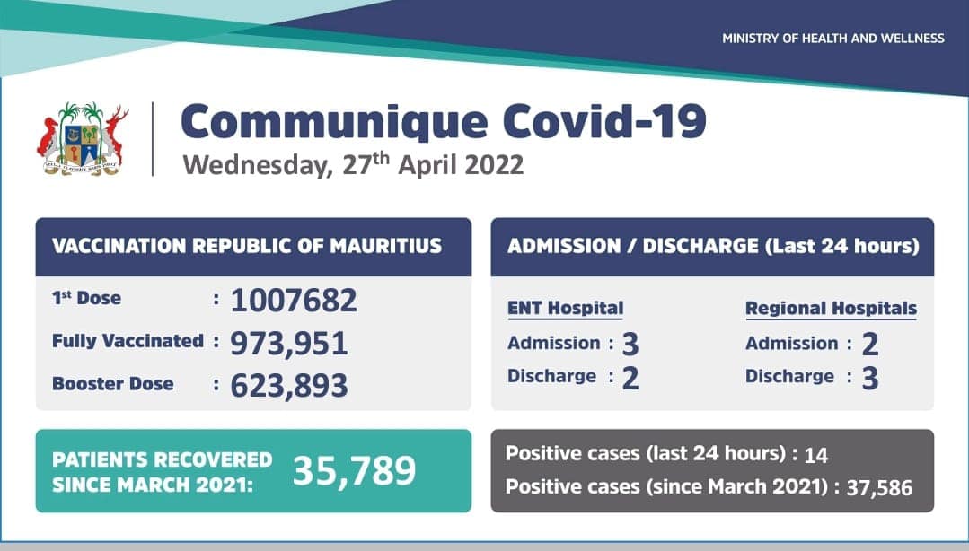 Naresh: Le 27/04/2022 à 16:29 | MAJ à 10/07/2024 à 19:00 Main picture Publié : Le 27/04/2022 à 16:29 | MAJ à 10/07/2024 à 19:00 FB TW WS Chiffre communiqué par le ministère de la Santé ce mercredi. 5 patients ont été admis dans les hôpitaux, dont 3 à la New ENT. 37 586 personnes ont contracté le virus depuis le 5 mars 2021. Mots clés Covid 19