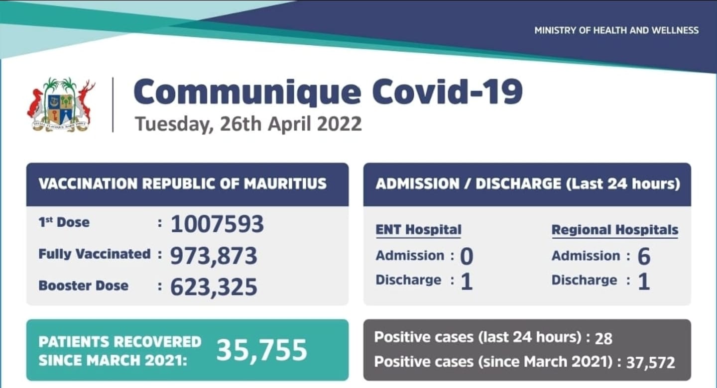 Alex: Le 26/04/2022 à 16:23 | MAJ à 26/04/2022 à 16:23 Main picture Publié : Le 26/04/2022 à 16:23 | MAJ à 26/04/2022 à 16:23 FB TW WS Chiffre publié par le ministère de la Santé ce mardi. 6 patients ont été admis dans les hôpitaux régionaux. À ce stade, 37 592 cas locaux ont été enregistrés depuis le 5 mars 2021. Mots clés Covid 19