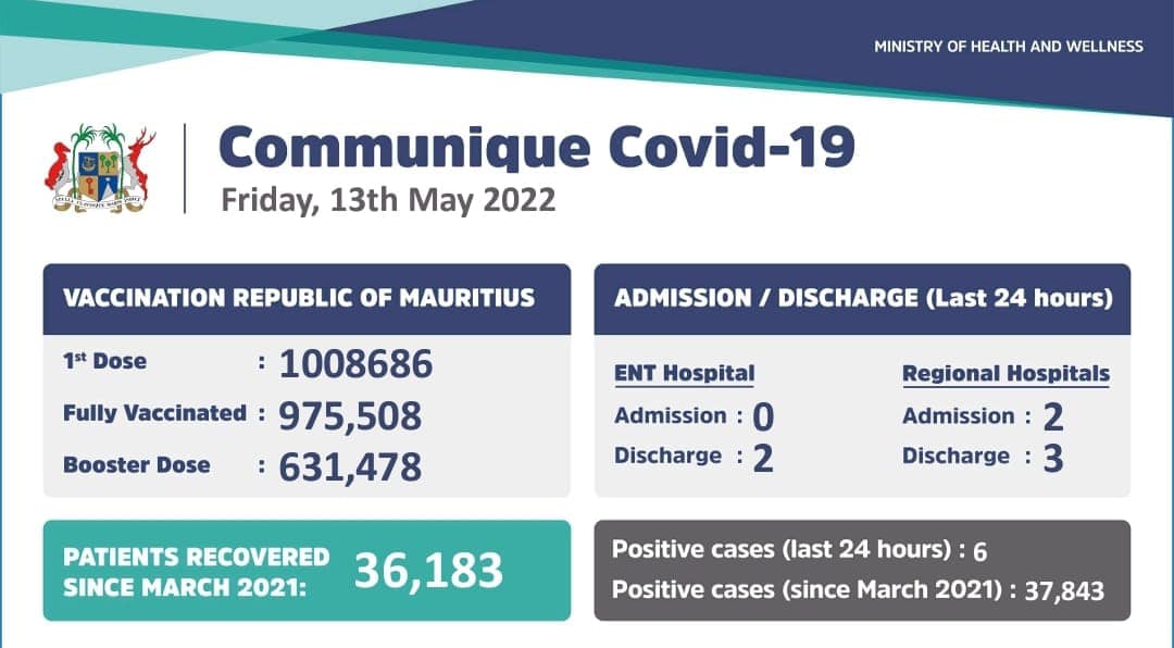 Naresh: Le 13/05/2022 à 14:44 | MAJ à 10/07/2024 à 19:09 Main picture Publié : Le 13/05/2022 à 14:44 | MAJ à 10/07/2024 à 19:09 FB TW WS Il y a eu 2 admissions dans les hôpitaux régionaux. Depuis le 5 mars 2021, 37 843 cas d’infection ont été répertoriés. Reported by: Namrata Deelchand Edited by :Michael Jean Louis Posted by : Sarveshwara Sunassee Mots clés Covid 19