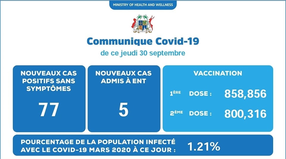 Naresh: Le 30/09/2021 à 19:34 | MAJ à 10/07/2024 à 19:00 Main picture Publié : Le 30/09/2021 à 19:34 | MAJ à 10/07/2024 à 19:00 FB TW WS C’est ce qu’indique le ministère de la Santé dans un communiqué émis en début de soirée. 5 patients ont été admis à l’hôpital ENT et les 77 autres sont considérés comme étant asymptomatiques. Depuis mars 2020, 1,21% de la population a contracté le virus.