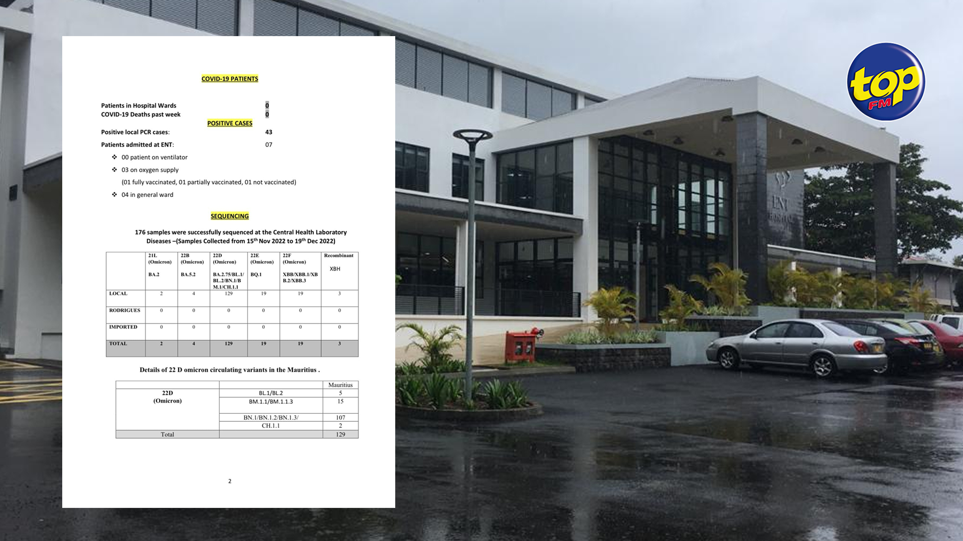 Jessila: Le 20/01/2023 à 14:45 | MAJ à 10/07/2024 à 19:00 Main picture Publié : Le 20/01/2023 à 14:45 | MAJ à 10/07/2024 à 19:00 FB TW WS C’est ce que révèle le bilan du ministère de la Santé ce vendredi. 43 cas positifs ont cependant été enregistrés depuis le 13 janvier. 7 patients sont admis à l’hôpital ENT, dont trois sous oxygène. Mots clés Aucun Covid 19 décès