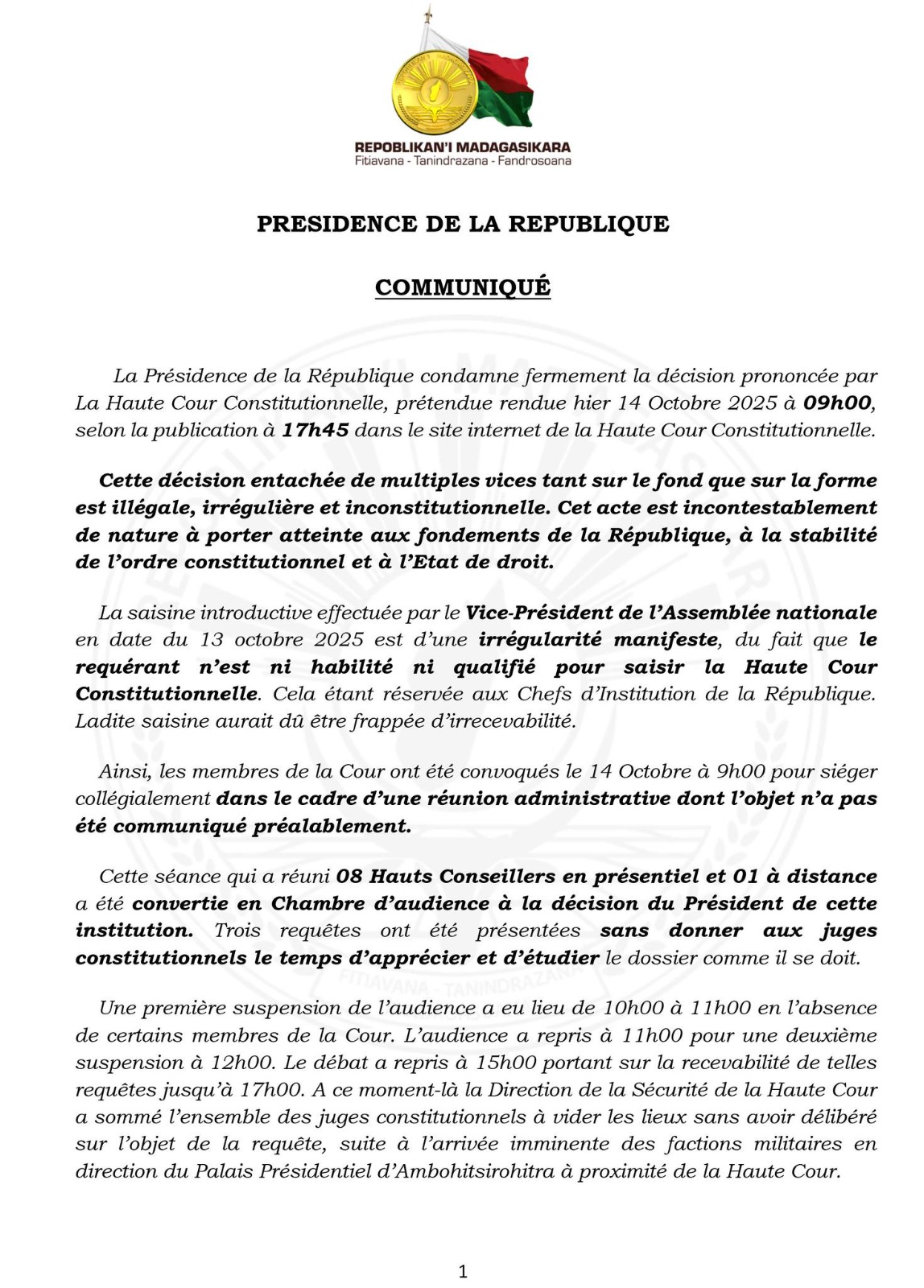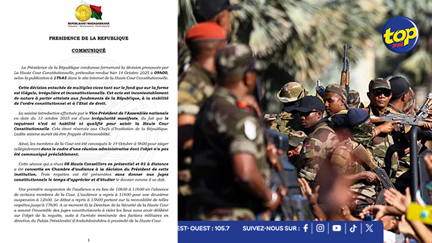 La Présidence de la République de Madagascar a fermement dénoncé la décision rendue par la Haute Cour Constitutionnelle (HCC), publiée le mardi 14 octobre 2025 sur le site officiel de l’institution, et prétendument prononcée le même jour.