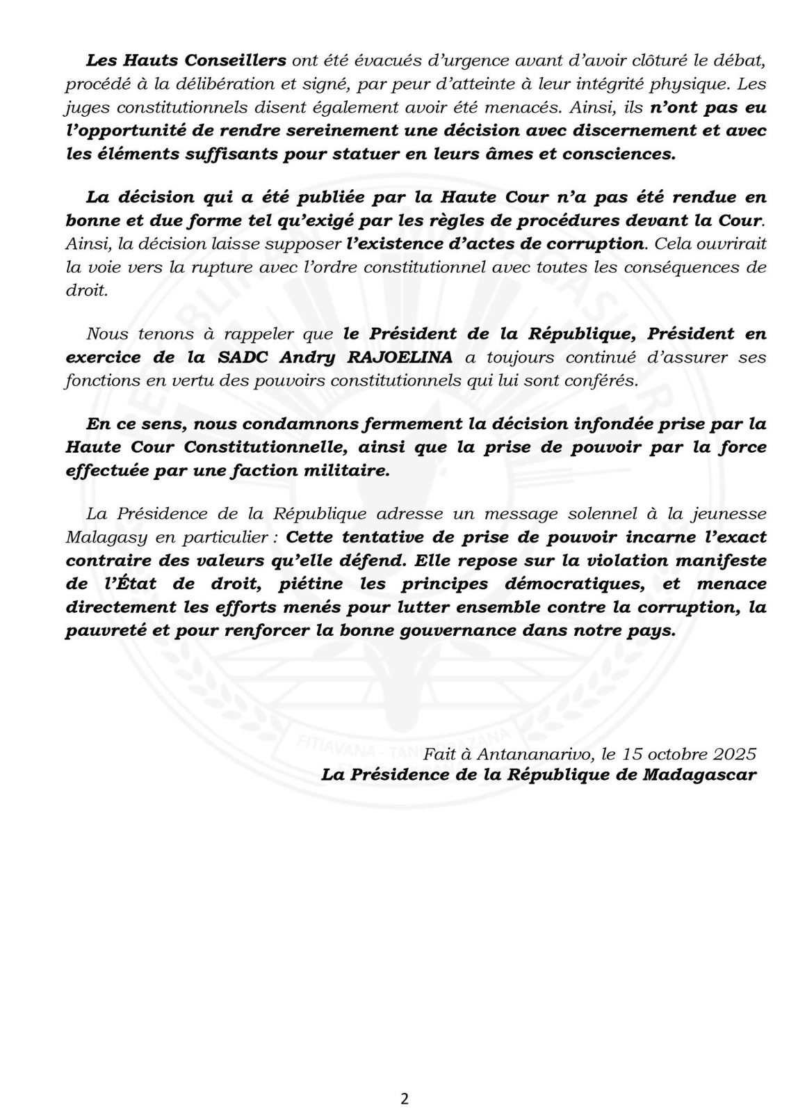 Enfin, la Présidence adresse un message à la jeunesse malgache : la tentative de prise de pouvoir par la force, impliquant une faction militaire, constitue une violation des valeurs démocratiques et menace les efforts de lutte contre la corruption, la pauvreté et pour la bonne gouvernance dans le pays.