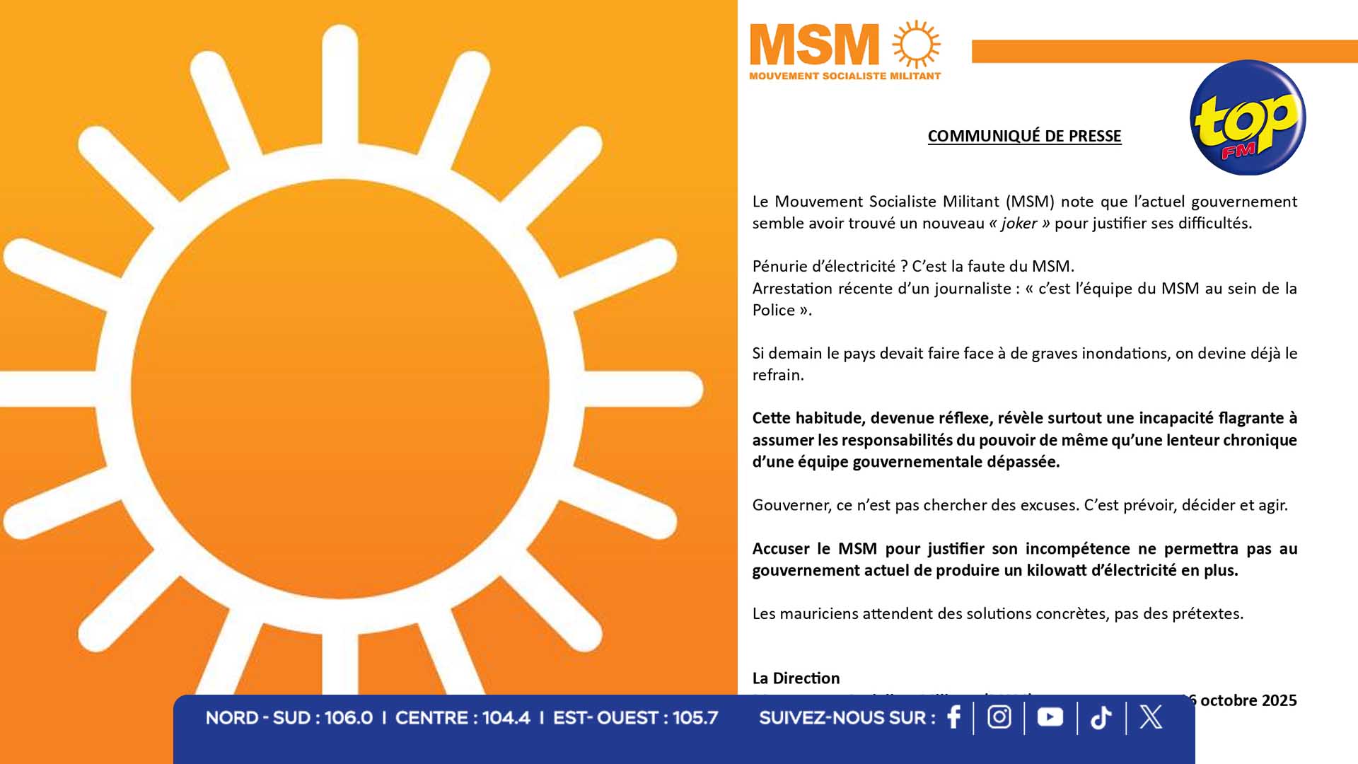 « Pénurie d’électricité ? C’est la faute du MSM. Arrestation récente d’un journaliste ? “C’est l’équipe du MSM au sein de la Police”. Si demain le pays devait faire face à de graves inondations, on devine déjà le refrain », peut-on lire dans le communiqué.