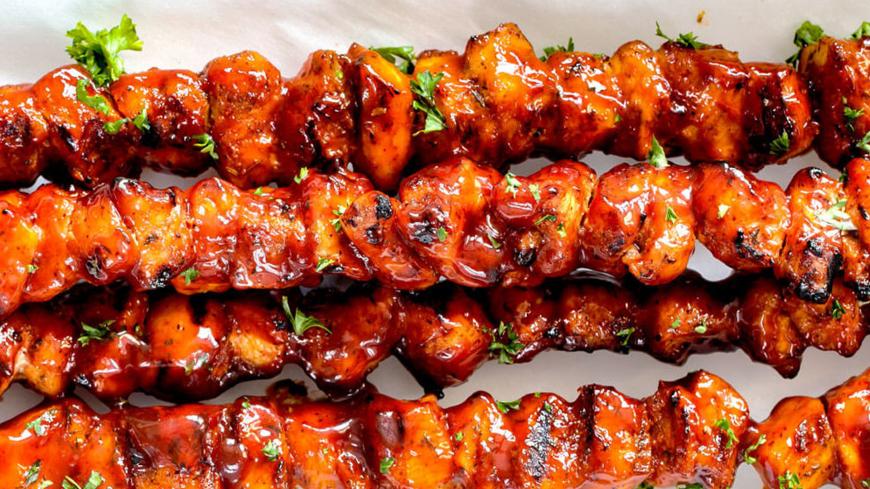 - Accompagner les brochettes de poulet de riz et de salade verte, si désiré. Servir avec le reste de la sauce barbecue.