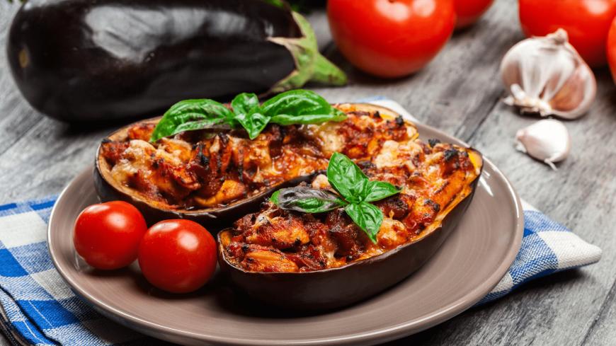Dans un plat pour le four ou une cocotte (par exemple, un Ultra pro 2L Tupperware), étaler une couche de sauce à la tomate au fond, y placer les peau d’aubergine et les remplir avec le reste de la préparation mélangée aux pâtes.