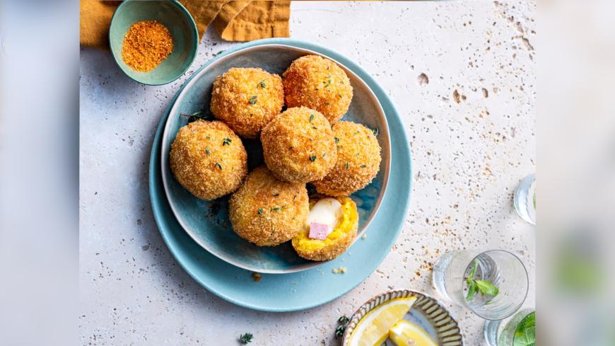 - Faites chauffer l’huile de friture, passez chaque boule de riz dans l’œuf battu et dans la chapelure. Faites-les frire 3-4 min en les retournant. Égouttez sur une feuille de papier absorbant.
