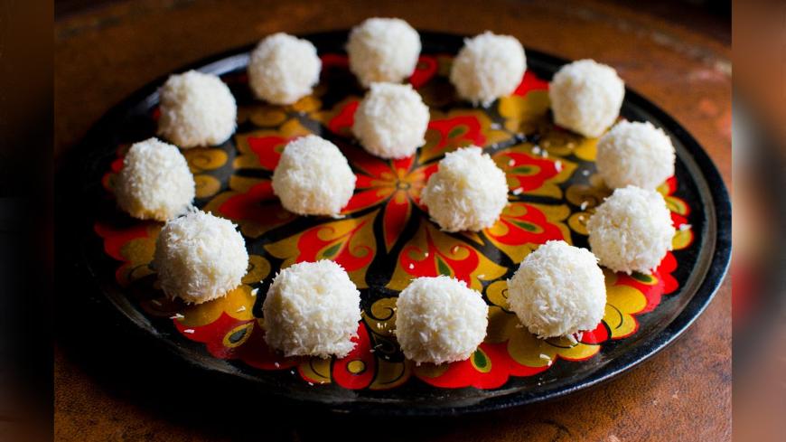 Verser de l’huile sur vos mains et prenez un peu de pâte et former une boule ensuite rouler la boule sur la noix de coco râpée. Faites de même avec le reste de la pâte.