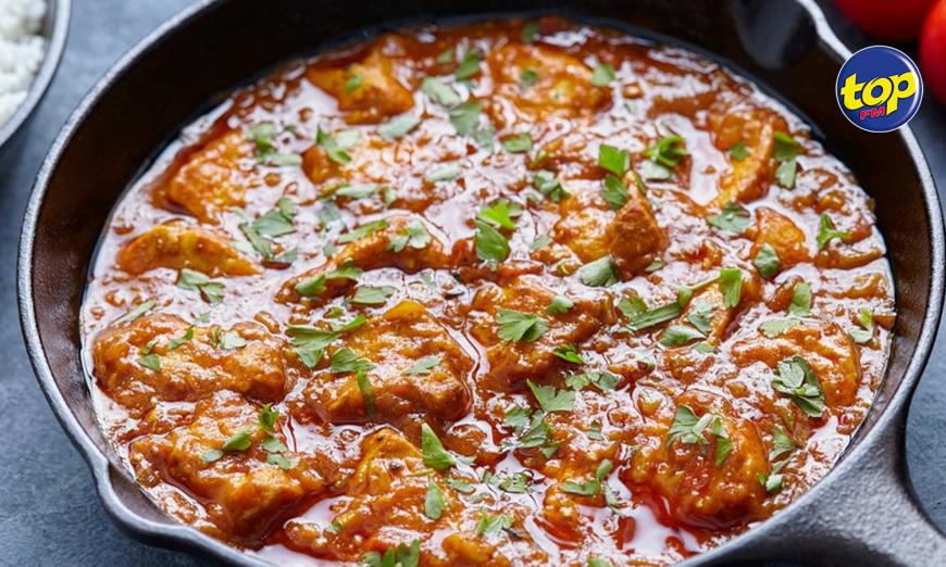 Mixez les tomates pelées pour obtenir une purée lisse. Dans une poêle avec de l’huile mettez la coriandre, le cumin et le curcuma pendant 1 minutes puis ajoutez la purée de tomates. Laissez mijoter pendant 10 minutes.