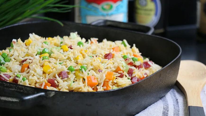 5. Dans une poêle, faites chauffer de l’huile, ajoutez le riz cuit, l’omelette, les petits pois et les cubes de jambon puis laissez cuire 5 min en mélangeant.