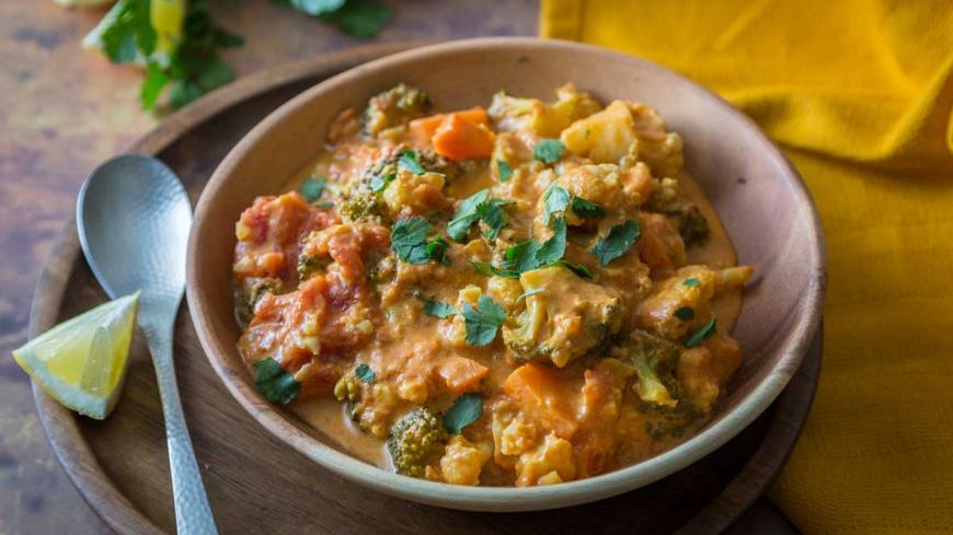 Ajoutez les tomates concassées, le chou-fleur, le brocoli, la carotte et le reste du lait de coco. Laissez cuire à frémissement pendant environ 30 minutes en remuant régulièrement. 5 minutes avant la fin de la cuisson, ajoutez une grosse cuill