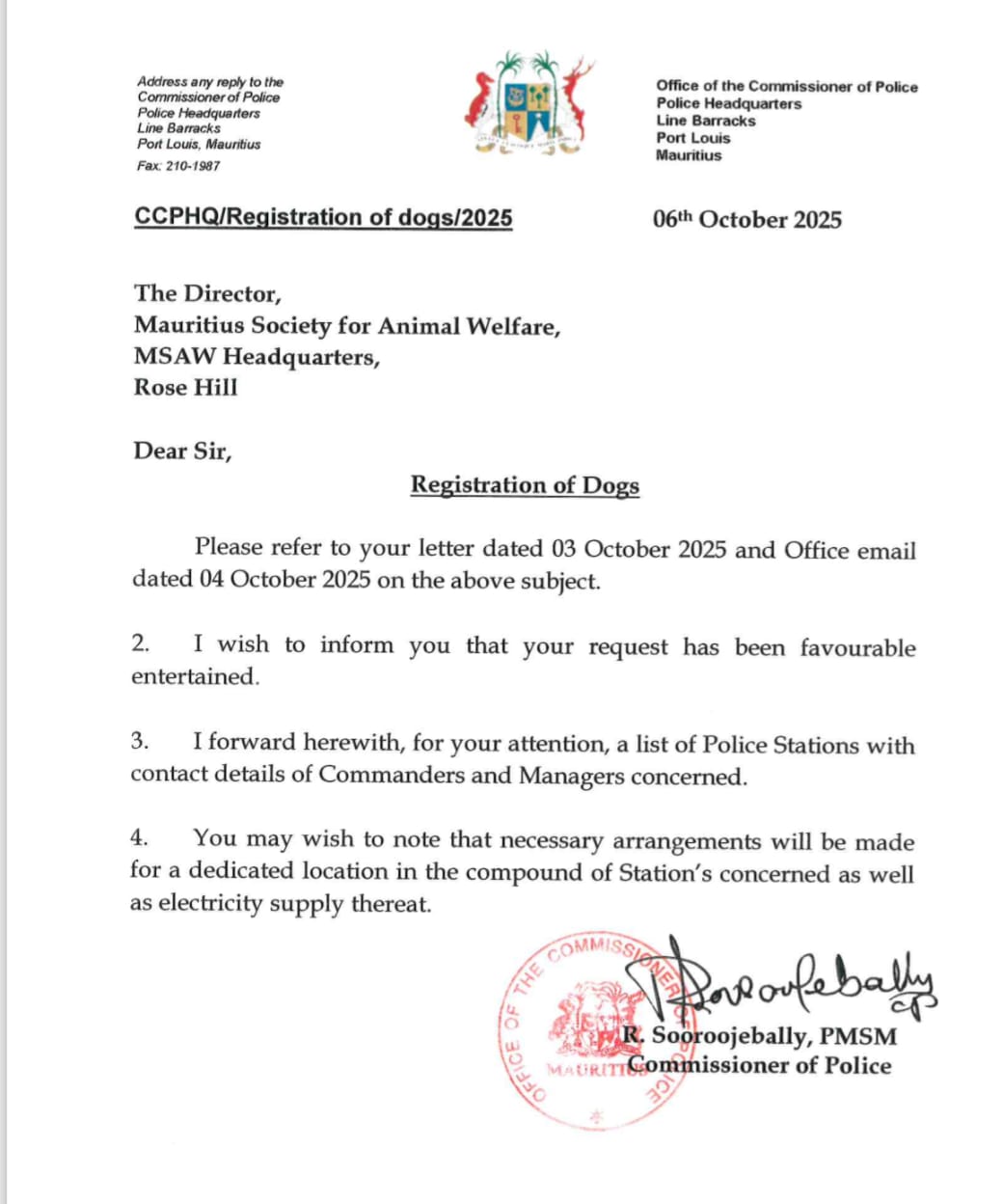 Avec l’entrée en vigueur de la Section 31 de l’Animal Welfare Act 2013, un grand nombre d’enregistrements est attendu. À cet effet, les postes de police à travers l’île seront temporairement mis à la disposition de la MSAW pour faciliter l’exercice.