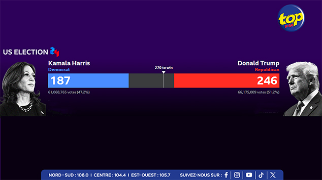 Donald Trump le républicain est donné vainqueur dans de nombreux États, il a déjà remporté près 246 grands électeurs, et Kamala Harris 187, le seuil est 270 sur 538, synonyme de victoire.