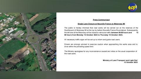 Main picture Autoroute M1 rond-point de Nouvelle France : la voie gauche sera fermée en raison des travaux voir plus