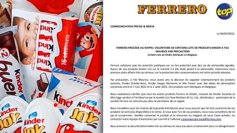 Main picture Cas suspects de salmonelle en Europe : certains produits Kinder à Maurice rappelés voir plus