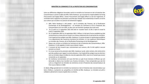 Main picture Suicide d’une Acting Procurement and Supply Officer : Le ministère du Commerce dit être prêt à collaborer à toute enquête voir plus