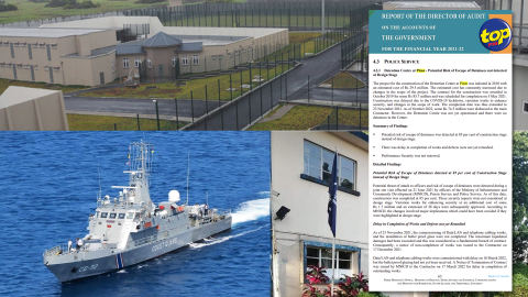 Main picture Force policière : le centre de détention de Piton, des bateaux de la NCG qui sont souvent inaptes pour la surveillance maritime et des bâtiments qui sont utilisés sans un fire certificate ou encore des policiers suspendus percevant toujours leurs salaires, déplorés par le bureau de l’audit. voir plus