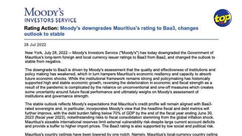 Main picture Moody’s rétrograde Maurice de Baa2 à Baa3 : Une baisse dans la qualité et l’efficience des institutions et le policy making ont affaibli la capacité de Maurice à absorber les chocs économiques, soutient l’agence de notation voir plus