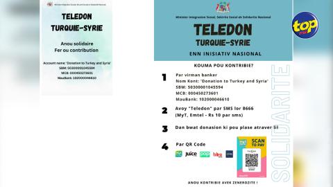 Main picture Teledon pour les sinistrés du séisme en Turquie et Syrie : Plus de Rs 8 millions récoltées, incluant les Rs 2,3 millions du gouvernement voir plus
