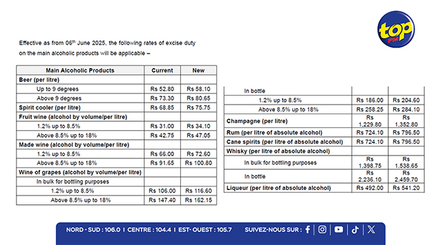 Lors de la présentation du Budget 2025–2026 hier, le Premier ministre et ministre des Finances, le Dr Navin Ramgoolam, a annoncé une hausse des droits d’accise sur les produits alcoolisés.