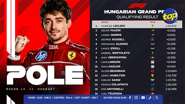 Dans une séance de qualifications haletante à Budapest, Charles Leclerc a signé une performance de maître en décrochant la pole position du Grand Prix de Hongrie, sa 27e en carrière. Sous les acclamations et l’euphorie dans le garage Ferrari, capturées dans cette image vibrante, le Monégasque a devancé Oscar Piastri et Lando Norris au terme d’un Q3 ultra serré, où les quatre premiers se tiennent en seulement 53 millièmes de seconde !