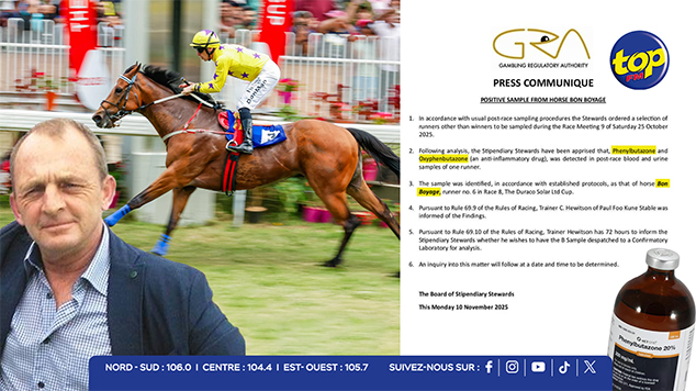 La nouvelle est tombée via un communiqué de la Gambling Regulatory Authority ce 11 novembre. Le cheval Bon Boyage, de l’écurie Carl Hewitson, engagé dans la dernière course de la journée du 25 octobre dernier, a été contrôlé positif à deux anti-inflammatoires interdits lors du prélèvement après-course.