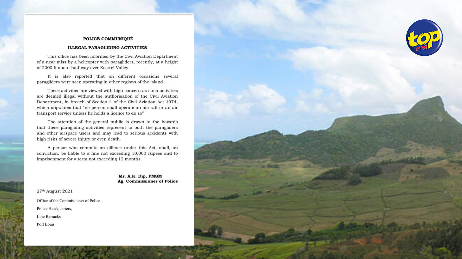 Toute personne qui opère un parapente sans l’aval du département concerné est passible d’une amende ne dépassant pas Rs 10 000 et d’une peine de prison ne dépassant pas 12 mois.