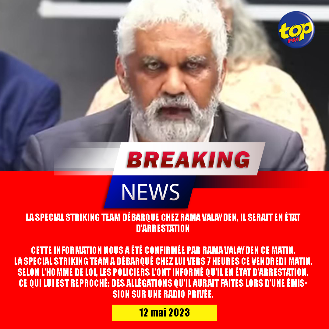Cette information nous a été confirmée par Rama Valayden ce matin. La Special Striking Team a débarqué chez lui vers 7 heures ce vendredi matin. Selon l’homme de loi, les policiers l’ont informé qu’il en état d’arrestation. Ce qui lui est reproché: des allégations qu’il aurait faites lors d’une émission sur une radio privée.