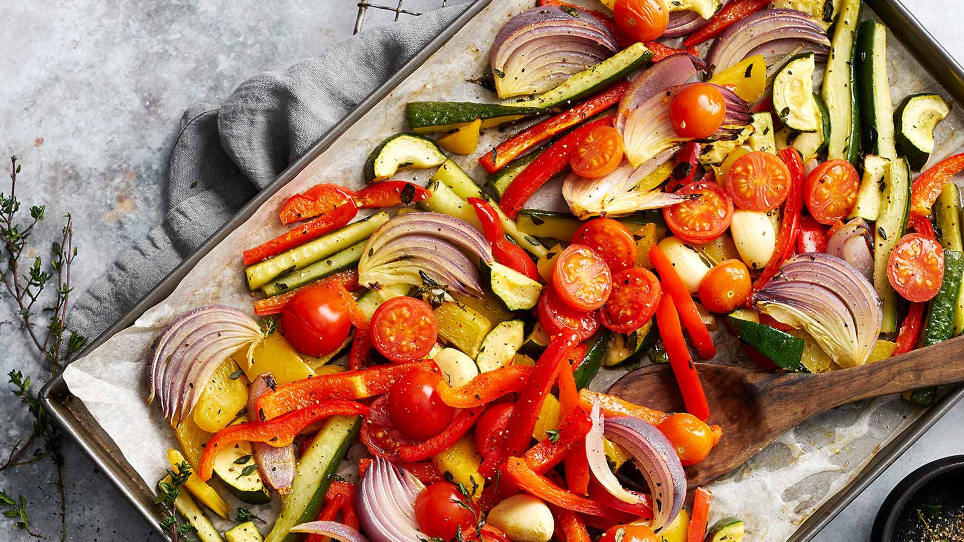 - Préchauffer le four à 200 °C. Peler l’oignon et l’ail. Couper l’oignon en quartiers, les légumes en morceaux à peu près égaux, mettre le tout dans un grand bol. Incorporer les herbes et l’huile, garnir, répartir le tout sur une plaque chemisée de papier cuisson.