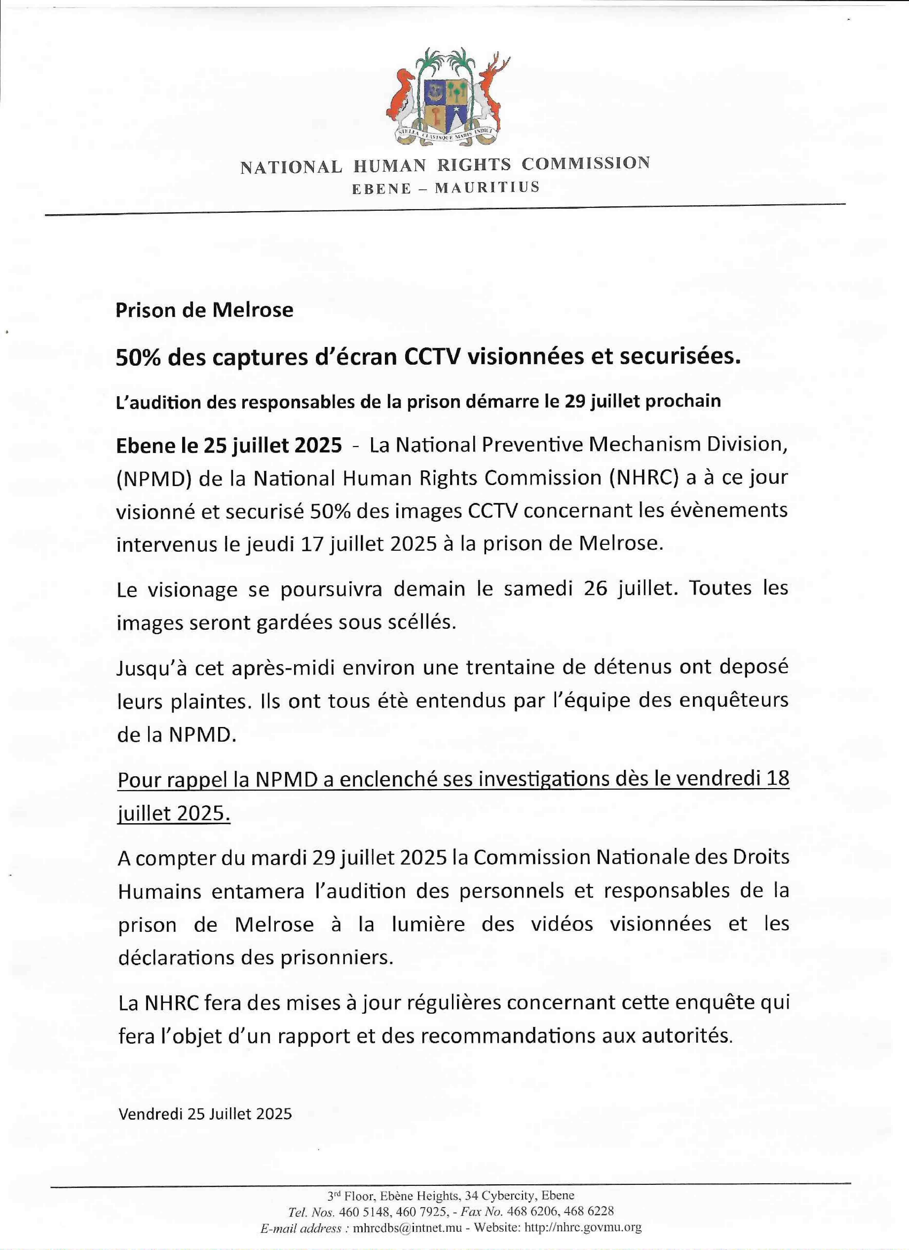 L’enquête sur les incidents survenus à la prison de haute sécurité de Melrose le jeudi 17 juillet progresse. La National Preventive Mechanism Division (NPMD), rattachée à la National Human Rights Commission (NHRC), a annoncé ce vendredi 25 juillet avoir visionné et sécurisé 50 % des images issues de la vidéosurveillance (CCTV) couvrant cette journée controversée.