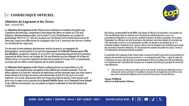 Shane: Le 16/04/2025 à 19:51 | MAJ à 16/04/2025 à 19:53 Main picture Publié : Le 16/04/2025 à 19:51 | MAJ à 16/04/2025 à 19:53 FB TW WS Les opérations de nettoyage de l’Île aux Bénitiers débuteront ce jeudi 17 avril PDF File