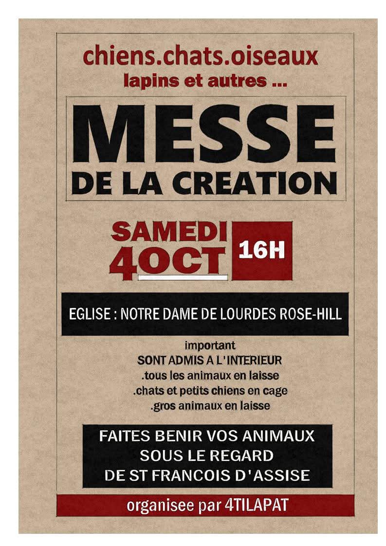 La traditionnelle messe des animaux fera son retour ce samedi 4 octobre à l’église Notre-Dame de Lourdes, à Rose-Hill. Prévue à 16 heures, cette célébration se tiendra en l’honneur de Saint François d’Assise, reconnu comme le « saint patron des animaux ». L’événement coïncide avec la Journée mondiale des animaux, marquée chaque année à la même date.