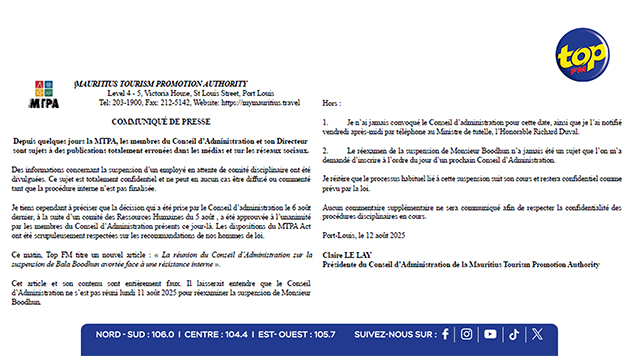 Par le biais d’un communiqué émis ce mardi 12 août 2025, la Mauritius Tourism Promotion Authority (MTPA) affirme que l’information publiée dans certains médias et sur les réseaux sociaux, concernant une éventuelle convocation du Conseil d’Administration de l’organisme, est « totalement erronée ».